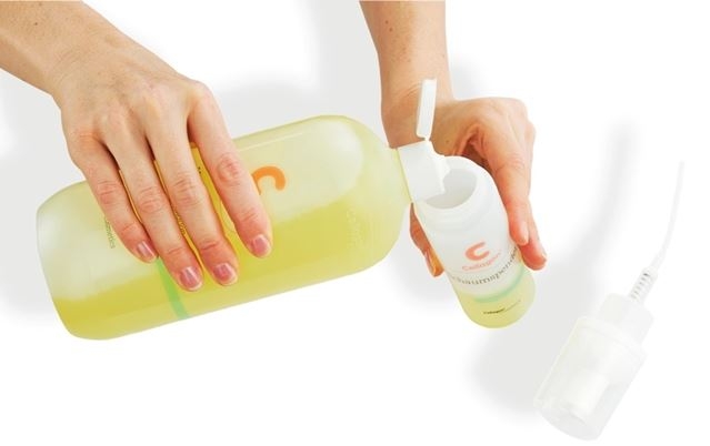 Füllen Sie den Spender bitte nicht bis zum Rand voll. Er läuft sonst über, wenn Sie die Pumpvorrichtung des Spenders wieder auf die Flasche schrauben.